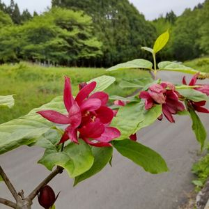 クロバナロウバイ (カリカンサス・ハートレッジワイン) ロウバイ科 里山散策中、初めて出会った花木に惹き付けれました。 花は赤褐色、蕾は黒褐色(チョコレート色?) まだ植えたばかりか樹高は1.5㍍位と低木ですが沢山の花が付いています。