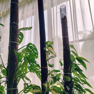 ハマっているモスポールたち。伸びたかなぁと毎日観察してしまう楽しさ🤣ツッコむ要素満載の集合写真ですが、ご容赦を💦 左は勢いで作ったためムダに太く、土深く埋めたので高さもないです😓巻きつけやすいので、これはこれでヨシですが、継ぎ足しとか不安。 そこから進化して?支柱で固定、モスポールをそこまで埋めない&少し細め仕様にしたのが右2つ。成長を見越し、ポールを継ぎ足す前提での支柱(ハサミで切れる便利な支柱✂)です。 ポトスはちょっと趣向を変えてヘゴで。