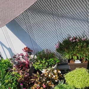 最高気温33~37℃☀6日間連続🔥日除けにタープを張りました。 ヒューケラの赤色の葉が日焼けしてチリチリになってしまいました😢 高温に弱い子や、植え付けや植え替えしたばかりの鉢を、タープ下へ避難させました。 朝🌄は陽が当たりますが、午後は日陰になります。みんな頑張って👊😆