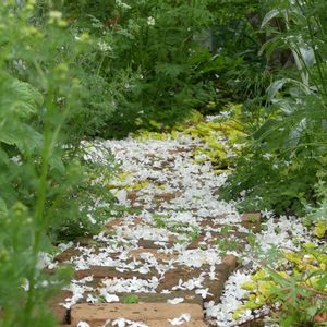 オオデマリが散って、レンガの小道が白い絨毯の道になっております。 一週間も前のpicなので、今はもう枯れてチリチリに😁 本日私の手の届く範囲で剪定しておきました。 とはいえ当方チビッ子なのでそこそこしか出来ませんが、ヒコバエの剪定なら任せろぃ!