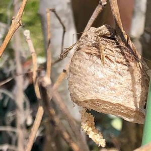 チビカマキリが出てきてる👀 お庭の見張り番、よろしく頼みます。 ブルーウイングの鉢に去年の10月についてた卵です。寒い冬を越して満を辞しての登場です。