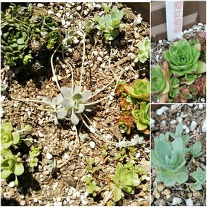 レンゲ系とミセバヤ系の一部 左下、ピーチパーフェクトはGSで知って、今年の冬にメルカリでポチりました🎶 ほんの7つくらいだったのに、瞬く間に増えて(๑•ㅂ•)و✧ 真ん中ユーパリ(夕張)ミセバヤも鉢増ししたら随分と増えました😉 右上、千島小岩蓮華も鉢いっぱい、鉢増ししたほうがいいかな〜 昨年は、ここから雨に当てすぎたのと猛暑とで、腐ったり小さくなったりで秋にも程々にしか復活しませんでした💦 ただ、根っこさえ残っていれば、冬を越して休眠明けからは更にパワーアップ⤴️⤴️👍