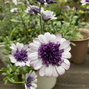 ダブルオステオスペルマム ブルーベリーシェイク 鉢から飛び出してゆらゆら咲いてます❁¨̮ 夏にお休みして10月初旬から咲きだし、またそろそろお休みかも。挿し芽の子も、いくつか根付いたみたい。 春には沢山咲いてくれるといいなぁ❁⃘*.゚