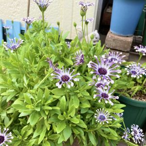 オステオスペルマム 今年はスパイダーという名に少し近付いたような🕸️🕸️🕸️ 何年かの冬越ししてます 去年、単体に植え替えたらスクスク育って…冬の間に蕾がたくさん しかし、寒すぎるので咲くわけなく 春になっても変わらず… なのに成長するから、収集つかない感じでクネクネに⤵️ 咲かせたいがため、そのままです💦 無事咲いてよかったけど、株は疲労してるかも。 梅雨前に切り戻さなきゃ〜✂️