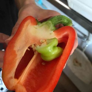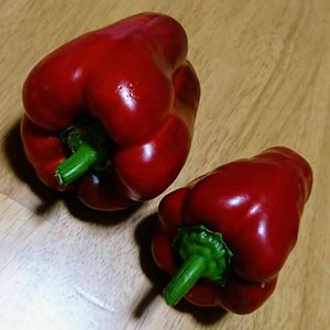 赤パプリカ収穫です!こちらもビギナーズラックなのか、一本の苗に10個くらい成りました(*´∇`*)♪パプリカの肉詰め作りました‼️