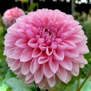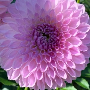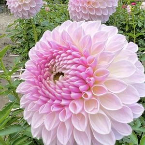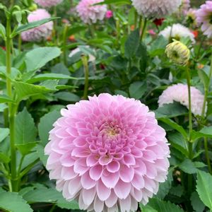 ダリア 詩織 中小輪 優しいピンクのまん丸が素敵 ポールデコラ咲き ポールとはポンポン咲きの事でまん丸八重咲き💕 デコラは平たい花弁が平たく中心まで整然と並んで咲く八重咲き💕 咲き方で分類する事を知りましたが、今度投稿する時は、そこもあげられたらと思っています。 分かるとより面白く見ることができそうです‼️🥰