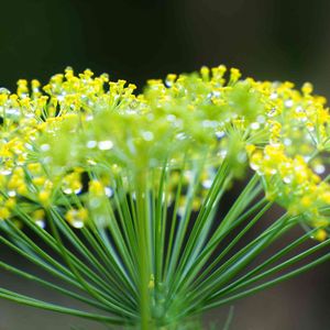 早朝の水遣り後のディル。 放射に伸びる花茎の美しさに見惚れます。 茶筅にも似てる。