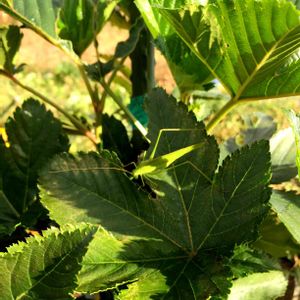 おはようバッタくん‼️この前はマリーゴールドの上で挨拶、今日は隣のラズベリーの葉の上で挨拶☺️