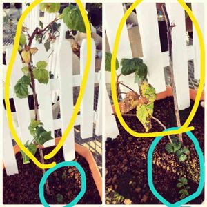 教えてください! 今回、初めてラズベリーの栽培をしたのですが、株元から新芽が出てきました。(水色円) 元々あった枝(黄色円)は、そのまま置いておいていいのでしょうか? それとも切ってしまっていいのでしょうか?