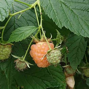 花壇の隅に生えてるイエローラズベリー、ぶどうの蔓に誘引させてます。 実が鳥とか虫に食べられる事が少ないおかげで、人間もありつけてます。見た目の割に赤色のラズベリーと変わらない甘さですね!