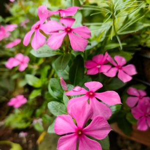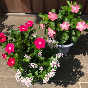 日日草🌸 夏花火と藍染め絞りの2種٩(*´︶`*)۶♪ 日中の日差しがだいぶ和らぎはじめて、 夏花火の花数が増えてきた😆❣️ 藍染め絞りは3年目✨ 木質化して、しっかり強くたくましく❗️