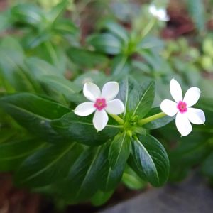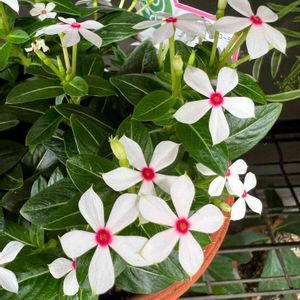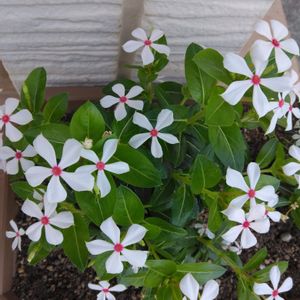 ビンカ(ニチニチソウ).夏花火♡ホワイトレッドアイ 初夏から秋までながーく咲く花 今年もリピ買いです。゚(゚´ω`゚)゚。カワイィ〜