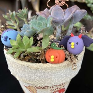 もうHalloweenの 10月‼️‼️‼️ 早いですね〜 ゴチャゴチャ飾りました🎃 トラディスカンティアは斑入りだったのに…先祖返りしてしまった💦👿 葉裏の紫も薄くなってしまった😭 とりあえず斑入りの部分だけカットして挿し木(?)葉挿し(?)してみたけど、何となくミドリンになってしまってる👿 頑張れ〜って密かに応援してます