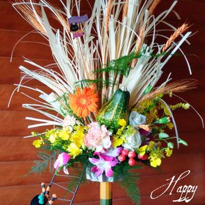 (^○^) 生花が長持ちしてくれるので イベント毎のアレンジメントを楽しめる季節になりました 薄く削った木の板を裂き 少しずつ束ねて 挿してあります 使った花材は 麦、ガーベラ、オンシジューム、デンファレ、ヒペリカム、カーネーション、バラ、アスパラガス等です ハッピー ハロウィン 🎃