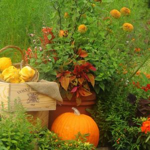 ギャザリング講座にて🌿 ①セロシアのハロウィン風寄せ植え🎃 12ポット ②コレオプシスのガーネット ③ジュズサンゴにパープルのセイヨウニンジンボク ④チョコレート色のユーパトリウムに可愛いアルテルナンテラ ⑤ポイントのオレンジ色はヒメザクロでハロウィンカラー
