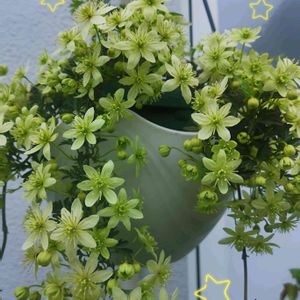 天使のすず クレマチス ピクシー 今年の開花は遅くやっと花が咲き出しました💚 常緑で枝いっぱいに花を付けます💚 2センチほどの可愛いお花です😆💕