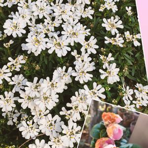 🤍イベリス🤍 ひと月前からチラホラ咲いてましたが 投稿グッと我慢して やっと満開🌸🤍🌸🤍🌸綺麗でしょ✨😍 朝の2、3時間の日照なので遅かったのかな? 右下はオマケ(≧∇≦) オトメツバキは綺麗に満開とはならずに 茶色くなった花びらです💦 蕾の時期に寒さに当てすぎたかな? 軒下だと良かったかしら〜😅