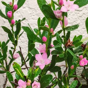 🌸サザンクロス🌸 ミカン科クロウェア属 白いのも育ててたのに 消えました💦 やはりピンクが基本なのかな? 何年も丈夫ですね(´-ε-`) 軒下で越冬させますが、葉も落ちずにいてくれます🤩 右手の真ん中に お花のミイラみたいな実殻が残ってますよ🤭