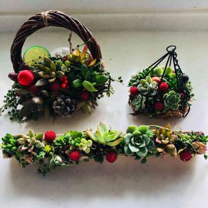 今年の門まわりのクリスマスディスプレイはシックに。 ちょっと寂しい気がする時は、多肉植物畑で葉っぱ一枚から育てた、チビ苗を使った寄せ植え(2点)も添えて。