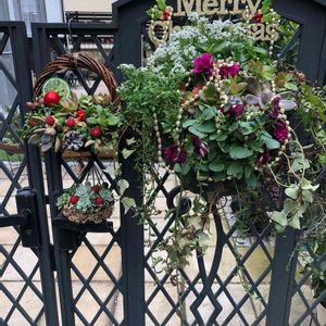 仕込み始めました! レモンガーデン(多肉畑)の用クリスマスディスプレイ。 リースとハンギング2つ 秋麗 白ボタン マーガレットレッピン ピンクプリティ 千両 セダムなどの、雨ざらしにできるもの。