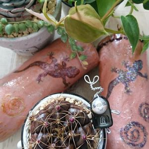 もぎった可愛い葉挿しも沢山あるけど… 寒波にも 酷暑にも 負けない! ヒョロヒョロの見切り品の葉挿しから大きく育った、最強 普及種トリオで🏷️葉挿しの日に ちょこっと お邪魔します(^.^)(-.-)(__) 空き缶を沢山溜め込んでしまったので💧リメろうと… 迷走しまくり…テラコッタ風の粘土の色が予想外に キモかったもんだから、キモいついでに 裏に下手くそな🦎描いた(艸ε≦●)♪ 何か無駄に時間かかった割りに変なん出来て🌀💦 粘土屋さんの試作を あれこれ考えてみるものの…こんなんではイカンな(´ε`;)ゞ コンナン ダレモイランナ これ どうしよう…と思ってる所に 記念日を迎える会にお誘いがあって… 忘れっぽいシエラには、毎回🏷️付け その内 忘れそうだし… 考え中🤔