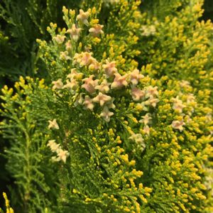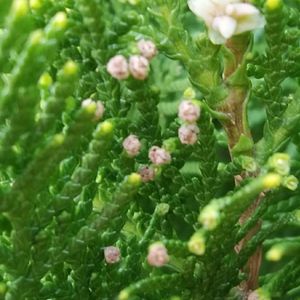 コノテガシワ 平面状の葉が子どもの手のひらに似ることから「児の手柏」と、呼ばれるらしい。 雌雄同株 ピンクの星状は雌花 葉の先に雄花が咲くらしい。