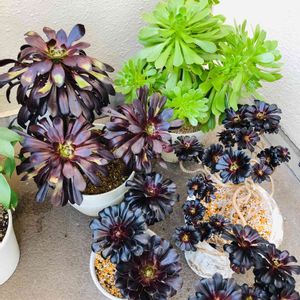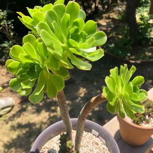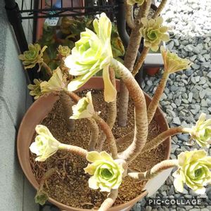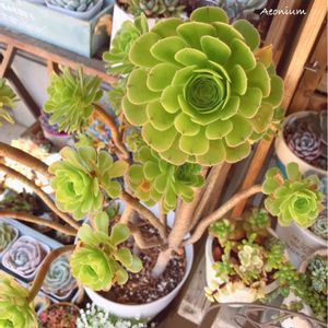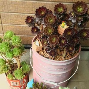 アエオニウムの葉が、ギューッと締まってきました。 お椀状なので、雨が溜まってしまいます😅 艶日傘の子供が大きくなってきて、ちょっときつそう。