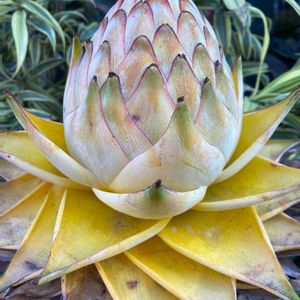 地湧金蓮(チユウキンレン)。 珍しく多肉植物から離れてますが、バナナの仲間です。 葉の先から先までで1メートル以上あります。3年〜5年で開花してそのままたくさんの子株を残して枯れてしまいます。11月頃には枯れてしまうはずなのですが、もう少し咲いていそうです。花びらのように開いている部分は苞で、苞の付け根に見えるたくさんの小さなモコモコが花です。