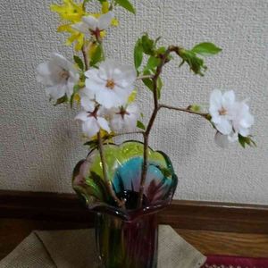 先日のレンギョウとポトスを八重サクラと生けてみました