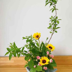 今日のお稽古 レンギョウ ヒマワリ スプレーカーネーション レモンリーフ 初夏を涼しく🌿