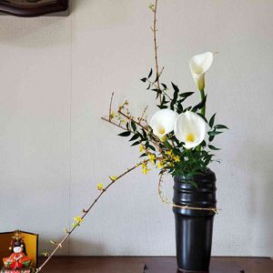 レンギョウの枝振りが良過ぎて、気分ノリノリで生けさせて貰いました💃 下垂型で…❣️