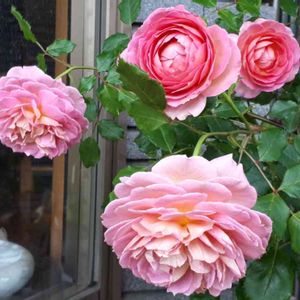 イングリッシュローズ「ジュビリーセレブレーション」 房咲きです。私の目線の高さで咲いています。150センチくらいかな?地植え5年目。年々高さが出て伸びています。もう少し低く咲いて欲しいので、冬剪定で少し切り詰めてみようかな。