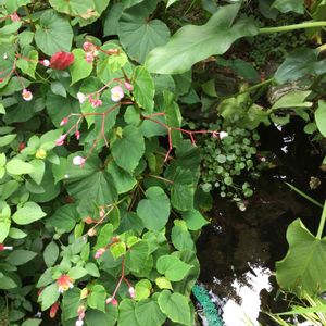 カラーの大きな葉っぱが乗ってしまい太陽が遮断されていたウォーターマッシュルーム😅 シュウカイドウもワサワサで目立たない〜💦 好きな葉っぱなのにごめんね〜😂