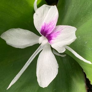 おはようございます♪ 新宿御苑の散策 🤍蕃鬱金(バンウコン属)🤍 ケンフォリア・ガランガ ショウガ科 インド原産 多年草 花は初めて見ました1.5〜2cm位の可愛いお花です 地面に張り付くように葉を広げ、その中心部に可憐な花を咲かせます、花は通常午前中のみ咲く貴重なものです。 全体に生姜に似た芳香と辛みがあり、香辛料(カレー粉の原料)として利用したりします