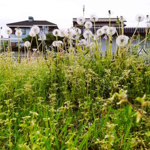 青空駐車場の縁に生えたタンポポの綿帽子 2024-04-22