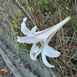 季節外れの花 1 殆どが枯れ草色になってしまった散歩道。 あらら、ビックリ😳 赤い筋の入ったタカサゴユリが咲いていました‼️ 蕾は何度か見付けたことがあるけど、花が咲く前に蕾のまま枯れてしまう。 頑張れ~🚩