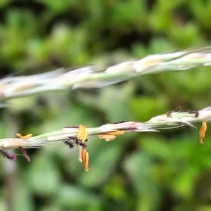 地味~な花 8 先に投稿したシマスズメノヒエに似ていますが、AIがタチスズメノヒエと教えてくれました。 小穂の葯が黄色いのが特徴でシマスズメノヒエは黒紫色なのです。こちらは何故か幼虫には見えないですね❣️