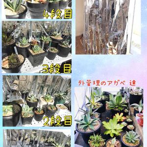 我が家のアガベ 達です🤗 大きな株達は、エケベリアと同じ外の多肉棚+プチプチコーティングで外管理中! 小さな株と斑入りは奥様が買ってくれた折りたたみ式四段棚+アルミシートコーティングで室内管理してます。 どうしても、陽当たり悪いのでアルミシートの反射光もプラスして、徒長防止に努めてます(つもり😅) LED欲しいけど外でも付けてるからね〜 とりあえず、今季はこれで様子見です。 元気に育ってね〜