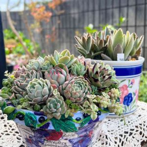 最近は おひとり様と葉挿しベビちゃん達に かまってて 手抜きの寄せ植え達でした 枯葉取って 雨の水滴飛ばして…… 癒されました(* ´ ` *)ᐝ やっぱり寄せ植えいいね💕