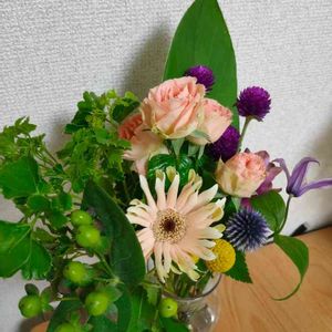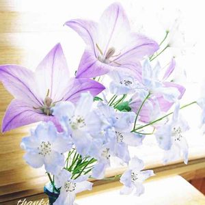 雨🌧️が止んで お庭の キキョウと スプレーデルフィニウムを 花瓶に✨ 強い雨、風によく耐えました プランターのサフィニアさんたちは荒れ放題で かわいそうな姿になってます〰️💦