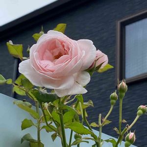 今年春に挿し木でもらった 小さいナエマの苗が 初めて❣️ 花を咲かせました💕 昨日までつぼみで 明日は雨だし☔️ ドキドキしながら 今朝見たら…これ❣️ あーーーーー!! 可愛いなあ🥰もう❣️ 初めまして❣️🥺 私、猫のおしりと申します。 とっても美人だね💕 後ろの小学校の教材みたいなトレリスはご愛敬😅 傘さしてあげようかな?🌂