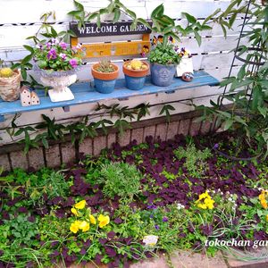 日陰気味なブルー雑貨ガーデン 地植えの咲きが甘い