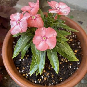 🌸サマーガーデン🪴に なりました❣️ まだ完全ではありませんが、ウチ🏠の小さな庭がサマーガーデン🪴になりました👍✨ ①ビンカ『ニルバーナカスケード ピンクスプラッシュ』…夏の強い日差しにも負けないお花ニチニチソウはウチ🏠の庭にはマストのお花🌸 ハイビスカス🌺のようなインパクトのあるお色🩷に惹かれてお迎えしました。さすがに隣りには爽やかな白いお花『スターティアラ』(ホワイト)を植えました。 その隣りは毎年お迎えの千日紅『ローズネオン』、上の段には白いペンタス🤍で爽やかさを演出。 ②去年に引き続き、イソトマ💜🤍🩷で涼しさアップ⤴️💕 ③ニチニチソウ『夏みかん』🍊↙️は珍しいオレンジ色🧡 ペチュニア『ディーバ』は爽やかなお色のラベンダーピンク💜↖️とチェリーモーン🩷↘️ ④上から撮ったpic🤳✨ 先週末からコツコツ植えました✊ ⑤今日夕方最後に植え替えしていたらえらく近くで小鳥の鳴く声がして、声のする方を探したらピンクのペンタス🩷の足元にいました。 スズメのヒナの子が巣立ったばかりなのでしょうか🤔 めちゃ可愛い⤴️💕 やはり近くでさえずっているもう一羽の声と呼びかけ合っていました🎶 暗くなりかけて水遣りをした頃には何処かに行ってしまっていました。 元気でたくましく育つんだよ🙏💕 こちらは観測史上最速で梅雨明けしました😅💦 今日も暑かった〜😓⤵️💦 帽子の中👒にも保冷剤、首にはネックリングをし、長袖シャツとしっかり日焼け止めをし、早朝と夕方に分けて作業しました。 長く置きかけていた待機苗🌱をなんとか植え替え出来てホッとしています😊✨