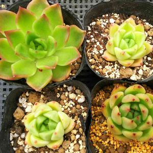 【雨の多肉作業】 (左上)アイボリーパゴダ カットしたコがシッカリ根付きました。 (右上)プベッセンス 緑と紫、寒かったり暑かったりの色♥️ (左下)朧月丼の足元に落ちた葉挿し 日が当たる→PINK 日陰→薄青 (右下)ゴールデングロウ レモンイエローの色♥️ 今日は雨の日♪ 涼しくて多肉ハウスでの、 リース作りです(^^) マイナスイオンと緑のベールに包まれて~お肌を保湿!
