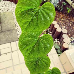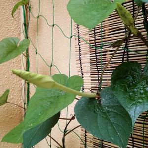 白はな夕顔 買ってきて三週間ほど 二葉だけ🌱だったのが1.2メートルほどになりつるがぐんぐん延びてます 花芽はまだありません ジャックと豆の木のお話を思い出しました🤣 上からみたらこんな感じだろうな( *´艸`)