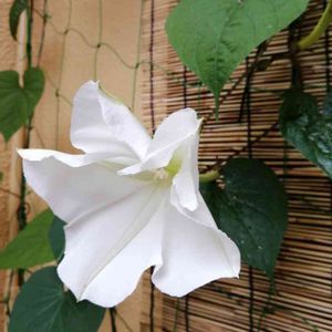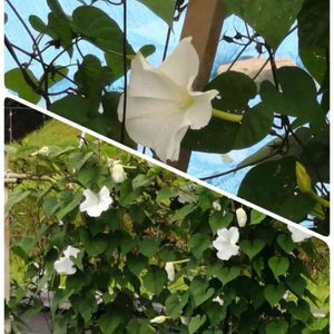 桜の木に咲く夕顔の花。朝だから、少ししぼんできてるけど😅