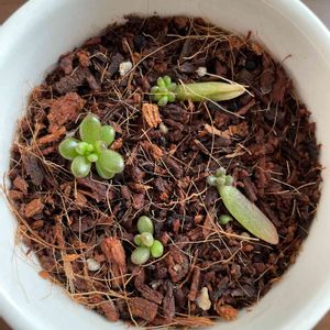はじめての葉挿しをして1ヶ月くらい かわいいミニ朧月がでてきた✨ うれしいな😊このまま大きくなぁれ😊 残りの2つは根も出てないけど出てきてくれるかなぁ