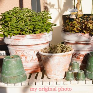 大きな2つの鉢は10数年前から使っていて ひび割れたり汚れたり😰 刷毛でペイント🎨してみました。 手前はスポンジでポンポンバージョン。 小さな1号鉢はチビ苗🌱を買った時の物です。 ワイヤーを通してピックに出来そう💚 西陽燦々のベランダにて📸