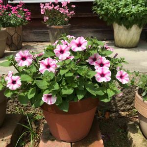 春にはローダンセマムやマーガレットが並んでいた玄関横の鉢置きコーナー🌼 今は、ペチュニアが主役です☺️