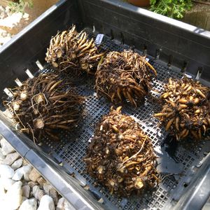 鉢植えのラックスを掘り上げました🧤 みんなちょうど片手いっぱいくらいのサイズでした♪ ムーサが分かれたがってたけど、小さくすると冬越し失敗しがちなので、そ〜っとステイ。 小さなポットに埋め戻して、雨が入り込むこともある日陰の軒下で夏越しします💤⏳️